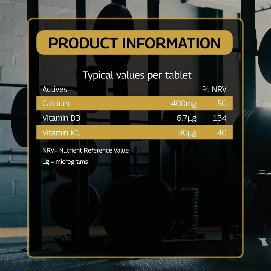 Informații nutriționale: Per tabletă: Calciu 400 mg (50 % VNR); Vitamina D3 6,7 µg (134 % VNR); Vitamina K1 30 µg (40 % VNR).
