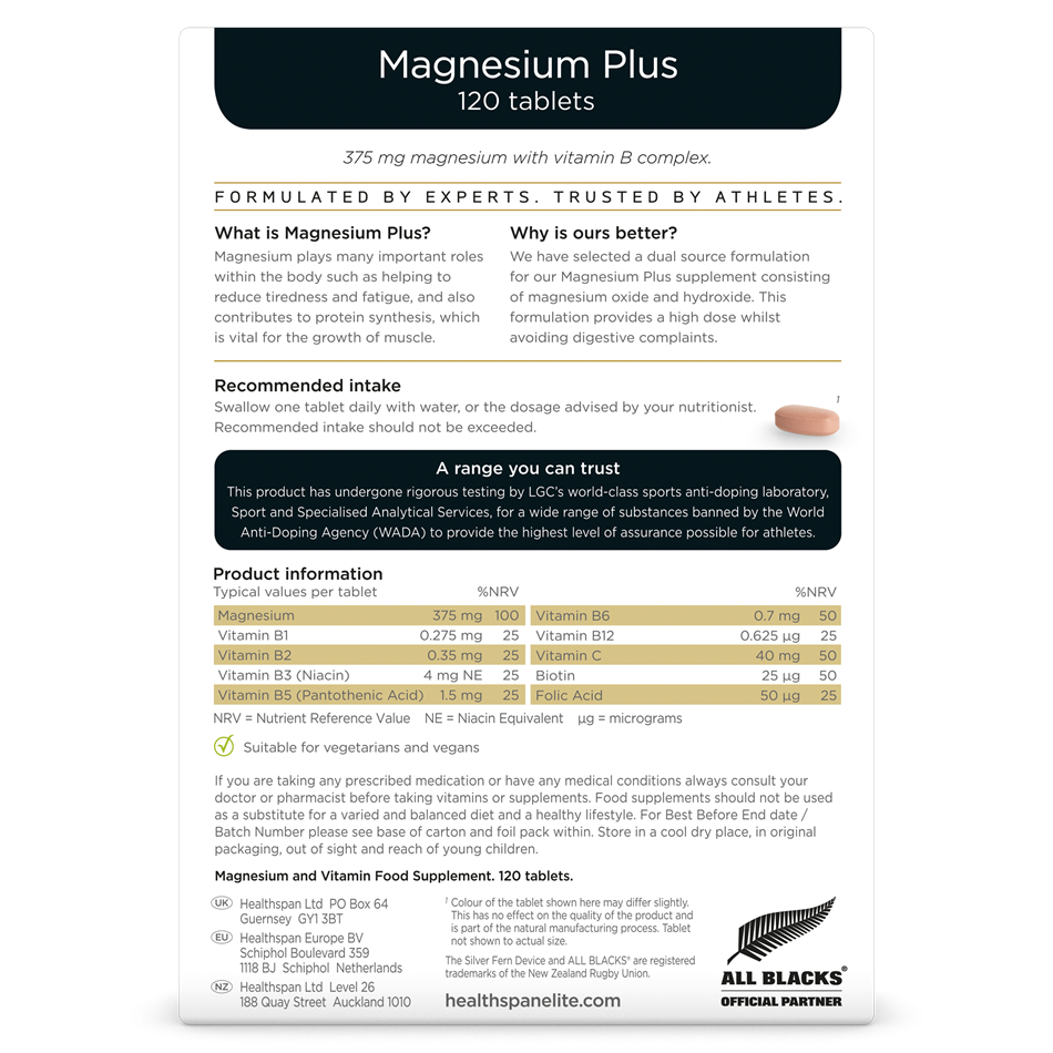 Healthspan Elite Magnesium Plus – 375 mg magneziu + vitamine B. Susține mușchii, oasele și reduce crampele. Certificat Informed-Sport.