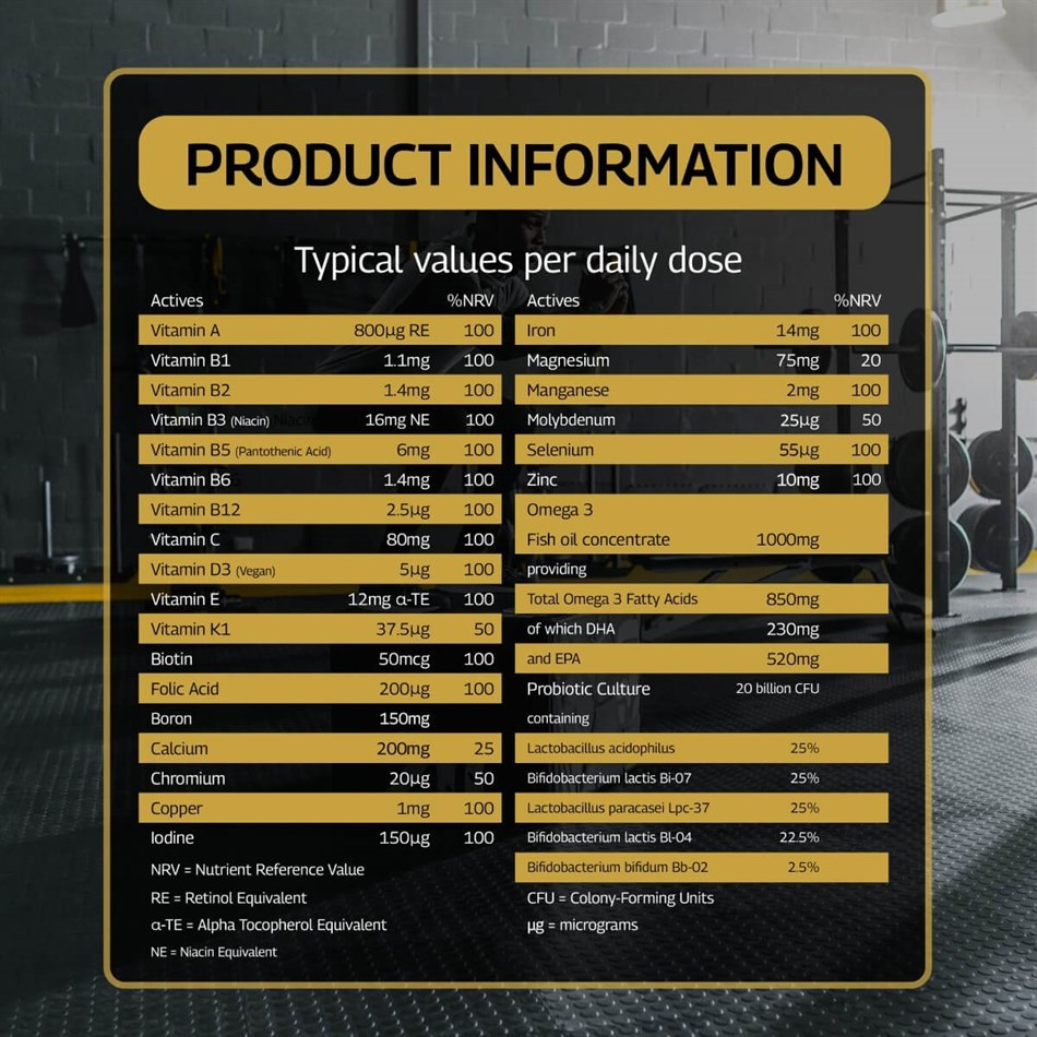 Ingrediente: Multivitamine A–Z (vitamine A, B1, B2, B3, B5, B6, B12, C, D3, E, K1; acid folic; biotină; minerale: calciu, magneziu, fier, zinc, cupru, mangan, seleniu, crom, iod, bor); Ulei de pește concentrat (EPA 520 mg, DHA 230 mg); Probiotic 20 miliarde CFU (L. acidophilus NCFM®, B. lactis Bi‑07, B. lactis Bl‑04, L. paracasei Lpc‑37, B. bifidum Bb‑02).