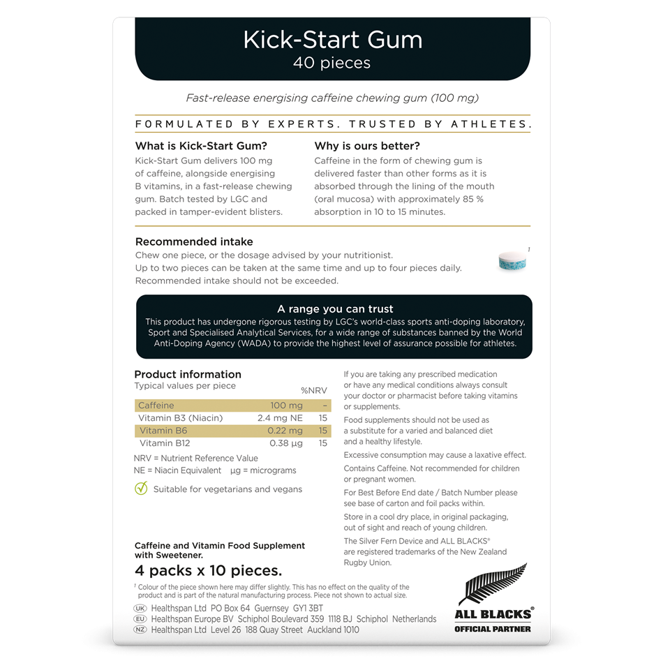 Ingrediente: Agent de încărcare (xilitol, sorbitol); bază de gumă; cofeină; arome; agent de îngroșare (carboximetilceluloză sodică); îndulcitori (sucraloză, acesulfam K); niacină; stearat de magneziu; vitamina B6; colorant: albastru briliant; vitamina B12.