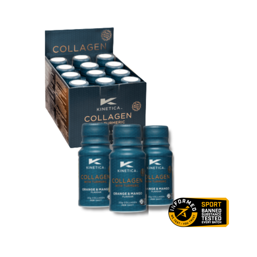 Kinetica Collagen Shot Orange & Mango furnizează 20 g colagen bovin per doză (60 ml), alături de Vitamina C (50 mg), turmeric (250 mg, cu 20 mg curcumină activă), glucozamină (150 mg), condroitină (100 mg, din pește) și Bioperine® (4 mg) pentru absorbție crescută.