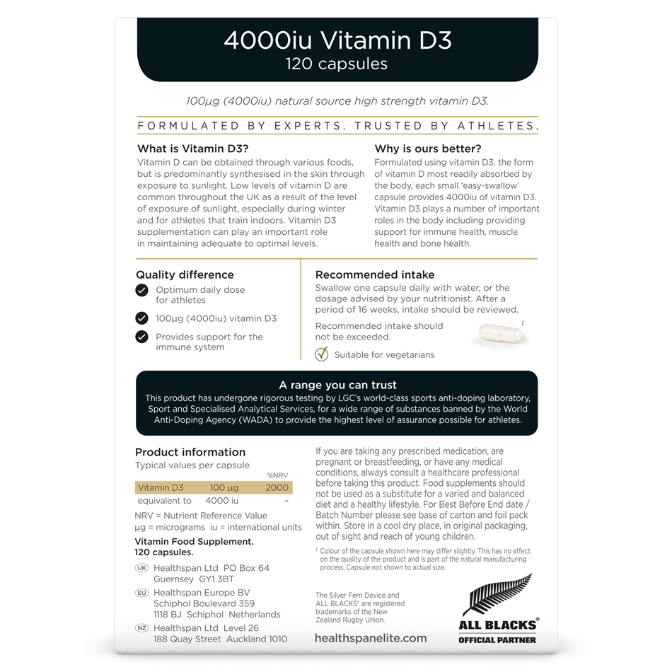 Informații nutriționale: Per capsulă: Vitamina D3 (colecalciferol) 100 µg (4000 IU) – 2000% VNR.